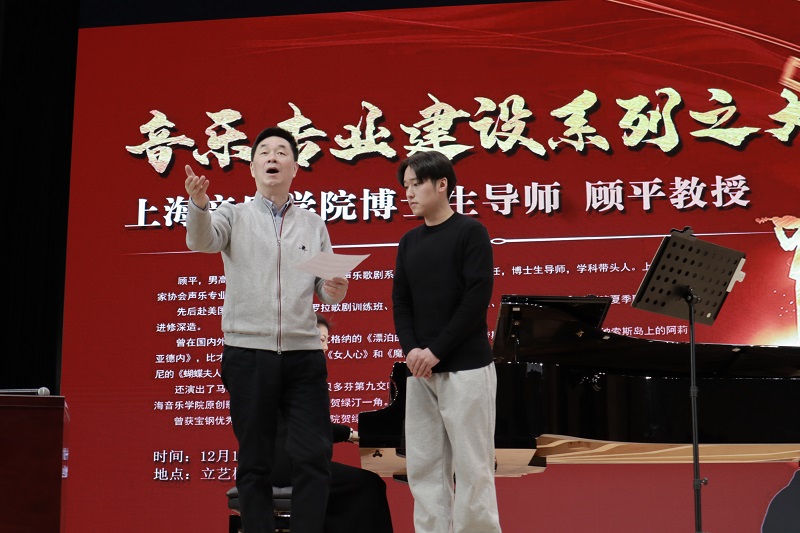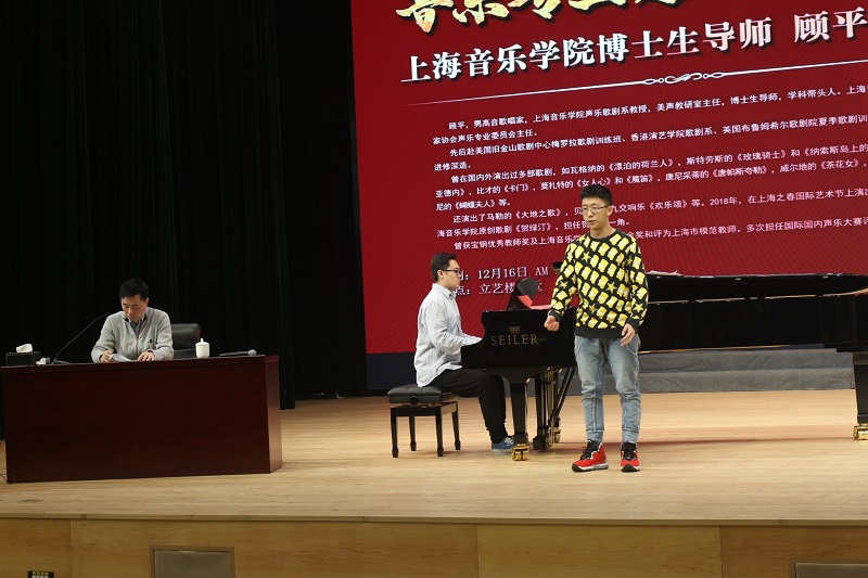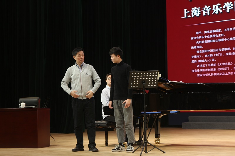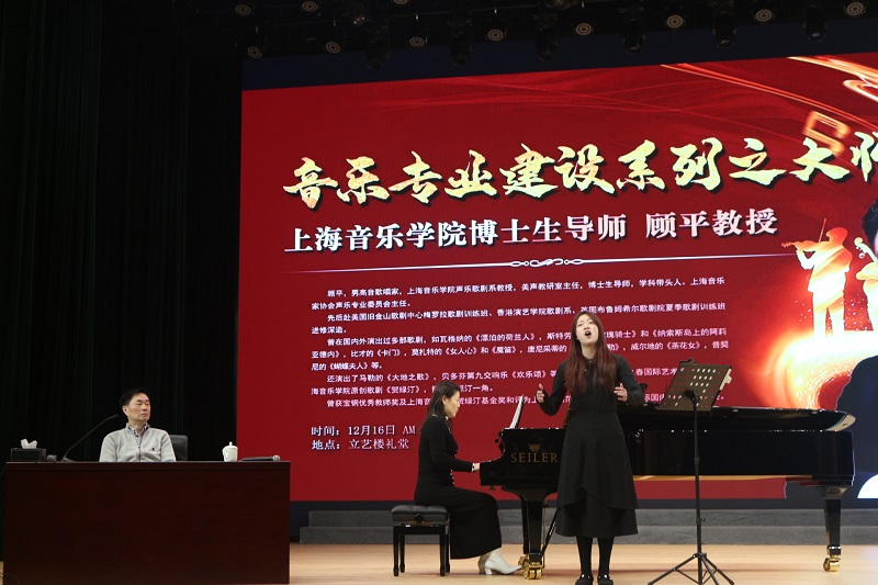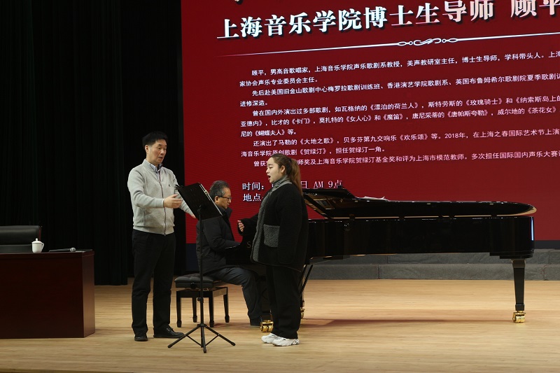 讲座采取一对一教学指导的方式,来自音乐系的5为同学依次现场演唱,更直观地展现声乐的魅力,方便大家的理解。顾平教授分别在声音、语言、情感、舞台表演等方面对学生进行了专业的指导教学。在授课中,顾平教授针对每个歌曲展示逐一分析指出每位同学的优点与不足,亲自示范讲解,强调了歌唱姿势、情感投入的重要性,用通俗易懂的语言讲解如何吸气、发音、使用正确的共鸣腔,让声音在不用音响的舞台上传达到每个角落。为了学生们的理解,顾教授特别为大家做了很多示范,生动形象,使同学们在演唱技巧上有了很大的提高,同时也解决了在场同学们在歌唱时常常会遇到的困惑。沈辛怡教授还亲自上台为同学们即兴伴奏,两位教授相互配合,倾情奉献,在场的同学全神贯注,陶醉其中,受益匪浅。