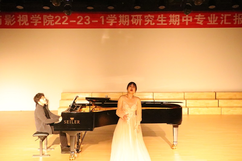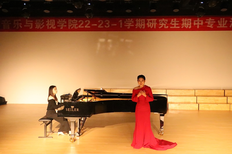 会上,音乐表演方向的研究生们演绎了一系列好听的音乐作品。张美茹同学演唱的《别董大》,悠扬的旋律展现了对友人远行的依依惜别之情;《阿瓦日古丽》曲调深情,抒发着对爱情的向往。罗珣同学带来的歌曲《江城子》平淡中寄寓着真淳;《二月里见罢到如今》节奏精简、动听、充满热情。胡炜同学带来的《被禁止的音乐》倾诉了思念、爱慕、离愁、哀怨等一系列情绪;《拾彩贝》则深切表达了对童年美好时光的追忆,同时也表达了对时光流逝的感叹。朱君毅同学的一首《盼》唱出了祖国人民渴望海外游子归家的真诚表达;《归来的星光》则是20世纪90年代中国的改革开放进入新的阶段,表达了浓浓的爱国爱乡情怀。李静雯同学的《越人歌》借山借水缓缓表达相思之苦;《怀念曲》中一句“旅行的水”将浓浓的思念之情寄给自己的恋人。陈君婷同学带来的歌曲《点绛唇赋登楼》,气势明朗,具有浓厚、鲜明的民族风格;钢琴曲《mope》旋律优美,曲调流畅,恬淡隽永,悠远动人。戴安娜同学演唱了《我的深情为你守候》,诉说了中华儿女对于祖国的热爱之情;《我爱这土地》表达了对土地最真挚、深沉的爱。曹天一同学带来歌曲《疼爱妈妈》,旋律真挚动人,唱出了慈母的一片舐犊之情和儿子对母亲的一片深情;《草原升起不落的太阳》则充满了诗情画意,展现出草原的辽阔美景。这些乐曲风格多样,现场气氛热闹非凡。