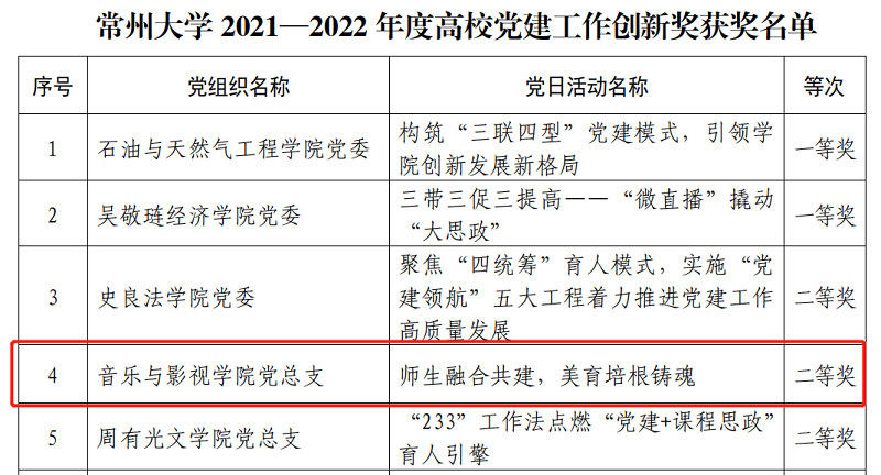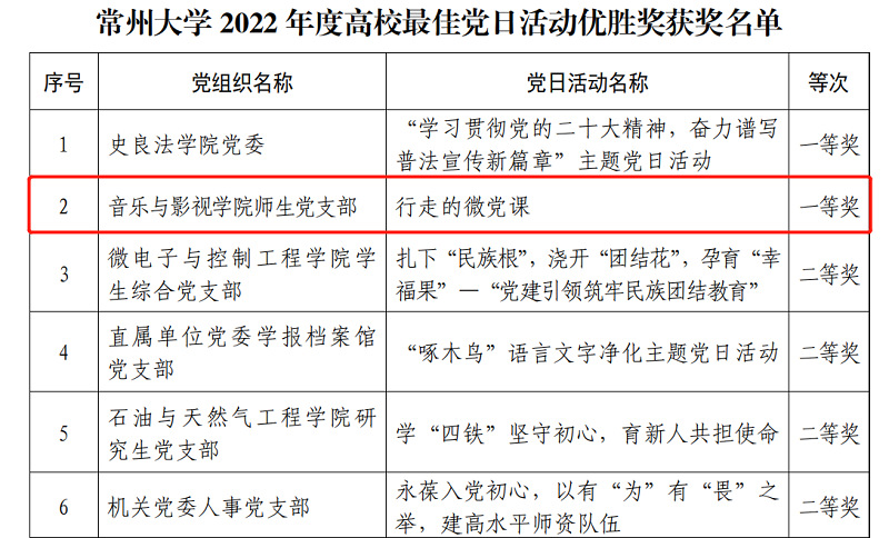 近日,中共常州大学委员会组织部发布《关于公布2021—2022年度高校党建工作创新奖和2022年度高校最佳党日活动优胜奖的通知》,比分足球比分 党总支“师生融合共建,美育培根铸魂”获常州大学2021—2022年度高校党建工作创新奖二等奖,比分足球比分 师生党支部“行走的微党课”获常州大学2022年度高校最佳党日活动一等奖。