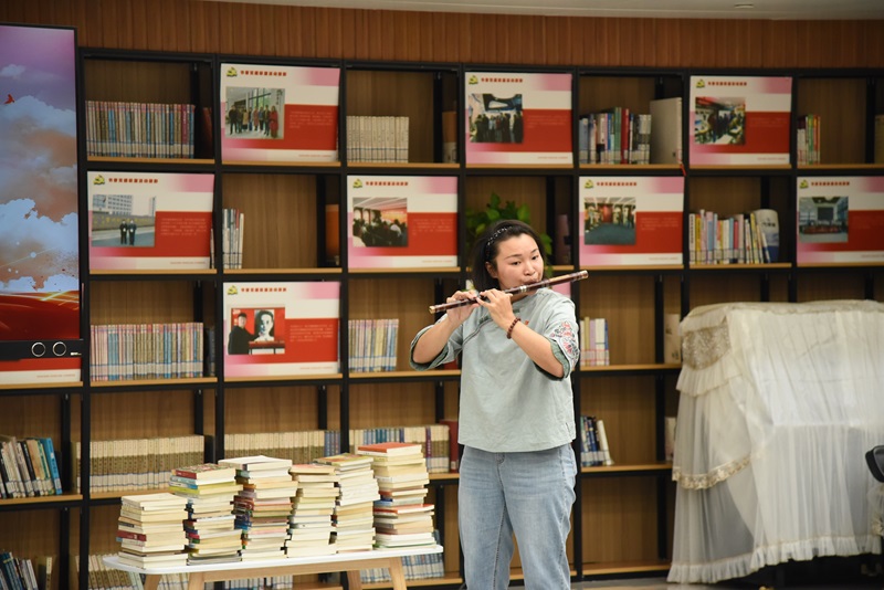本次“行走的音乐微党课”由党员杨柳琴带来独唱《我爱这土地》,歌唱前杨柳琴讲述了歌词创作的历史背景,这首诗作于国难当头、山河沦亡的抗战初期,诗篇中强烈而内在的感情、深沉而忧郁的基调通过委婉抒情感动人心的旋律表露无疑。其后,师生支部宣传委员马萧潇老师带来竹笛独奏曲《歌儿献给解放军》,马老师指出作品充分表达了藏族同胞的浓浓情谊,也充分体现了汉、藏同胞亲如一家的情怀。