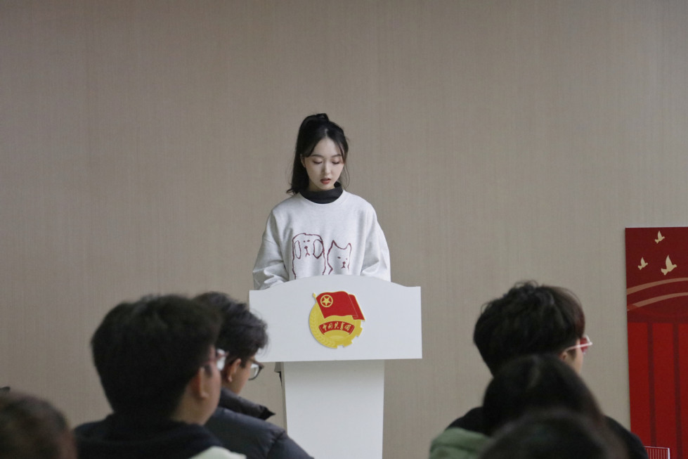 会议伊始,新发展团员马一茗、周思远在学生副书记吴侠佃的引导下进行了庄严宣誓。周思远表示,将以青年之身行国家之路、以青年之责汇国家之力,努力成为一名锐意进取、谦虚稳重的优秀共青团员。同时呼吁学员们努力学习科学文化知识,不断提高自身道德修养,仰望星空,脚踏实地。第十一期青马工程培训优秀学员代表刘佳慧表示,通过青马工程培训,深刻体会到了马克思主义的内涵与外延,作为新时代新青年,应在生活里克勤克俭;严格要求,在工作中身先士卒,勤勤恳恳,不断增强贯彻党基本路线的自觉性;在学习上,以“书山有路勤为径,学海无边苦作舟”的精神,不断增加新的科学文化知识,不断提高自我政治理论修养,努力争取在建设中国特色社会主义过程中建功立业。