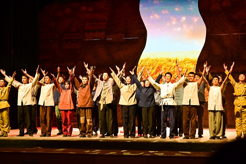 话剧版《生死场》改编自萧红先生的同名小说,讲述了九一八事变后哈尔滨近邻一个村庄的村民“生”与“死”的故事,它以民族意识觉醒之名,以反抗与斗争之名,阐释生与死的真实含义,反映了在遭受外来侵害时东北农民悲惨的生活状态以及逐渐苏醒的民族意识和反抗精神,让20世纪初的中国人蜕去在千年如一日的僵死乡村里风化的丑陋硬壳,使灵魂得以阔步,血性得以爆发,生命得以酣畅淋漓地呼喊。该剧的人物语言、戏剧风格更为写实,关于女性力量的叙述虽然隐晦但力量巨大。剧中人物个性鲜明、语言生动,胆子大的赵三、渴望挺直腰板儿的二里半、思想先进的王婆子,人物的成长与觉醒与其身份的极大反差感,呈现出一种独特又强大的影响力。该剧运用蒙太奇的手法,配合光与影,追求一种朴拙、雄浑、悲壮的美,在简洁的舞台上,一个个背负着苦难的生灵迈开生命的步伐,一盏盏悠悠亮起的南瓜灯,在黑暗中讲述着无尽的意蕴,引人深思。剧情采用非线性叙事方式,不同场景的切换衔接有序,一气呵成,形成强烈的舞台冲击力。剧中浓烈和悲怆的基调表达,已然不是这个时代的节拍,但依然能引起强大的共鸣,深深触动着每个人的心弦。在场观众被跌宕起伏的剧情和演员们的精彩演绎深深打动,所有人的民族情感在这一刻汇聚并共同燃烧,演出气氛相当热烈。师生们纷纷表示,整场演出感人至深,剧情震撼人心,演出结束后大家的心情久久不能平静。