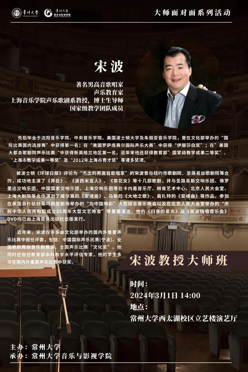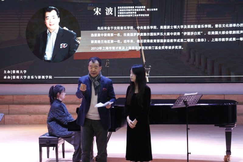在活动开始前,杨琳为宋波颁发了常州大学客座教授聘书。她指出,学校一直高度重视艺术教育,此次邀请宋波教授来校指导,是学校提升艺术教育水平的重要举措,不仅为学生提供了一个与专家面对面交流的平台,也为声乐专业注入了新的教学理念和教学方式。她希望音乐比分足球比分 师生能够珍惜这次难得的学习机会,不断提高自己的艺术修养和表演水平,也希望宋波教授为音乐比分足球比分 的发展给予关心和指导,进一步促进常州大学与上海音乐比分足球比分 之间的学术合作与交流。