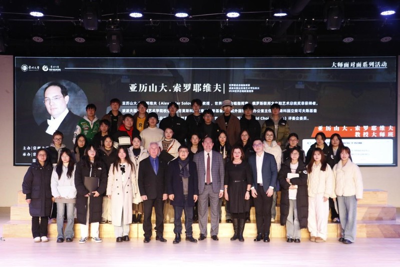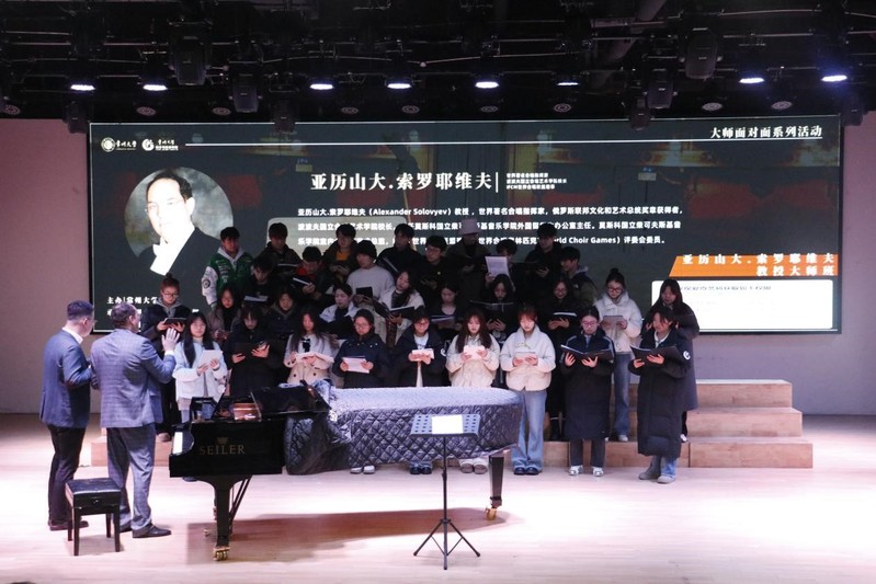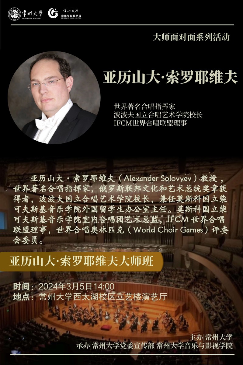 3月5日下午,亚历山大·索罗耶维夫教授在西太湖校区立艺楼演艺厅为常大师生带来了精彩绝伦的大师课,他首先介绍了世界音乐史上具有影响力的合唱家、指挥家、作曲家、演奏家以及俄罗斯当代各类重要的音乐节和赛事流程,并视频展示了他指挥演出的多场音乐会,随后他向我校特聘外籍专家欧丽佳·波利亚科娃教授赠送了自己汇编出版的作曲合辑,最后他向在场声乐系学生传授了莫斯科音乐比分足球比分 呼吸练声的方法,并对我校龙吟合唱团进行了详细的合唱实践指导,让在场师生受益良多。