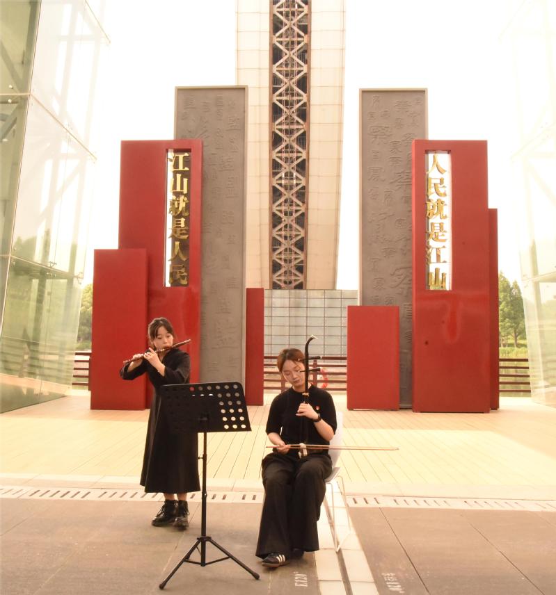 研究生党员郭鑫杰演奏了二胡独奏曲《映山红》,展现了革命先辈们坚定的信念和无私奉献的精神。青年教师李继祯演唱了《严守纪律歌》,歌曲以简洁明快的旋律和铿锵有力的歌词,强调了纪律的重要性,激励我们在工作和生活中始终坚守原则、严于律己。本科生党员吴侠佃、杨晨晨带来二胡笛子合奏《我和我的祖国》,将“我”与“祖国”命运紧紧相连的赤子情怀深入到每一个人的血脉之中。