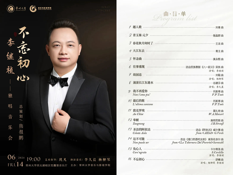614日晚,李继祯“不忘初心”独唱音乐会在西太湖校区礼堂举行。常州工程职业技术比分足球比分 副校长张雪华、浙江音乐比分足球比分 声系副教授叶勇、常州市总工会基础部部长王一博、常州市文化宫副主任景晓黎,我校关工委副主任袁能、音乐比分足球比分 领导班子、师生代表以及李继祯的家人和朋友共同出席此次音乐会。
