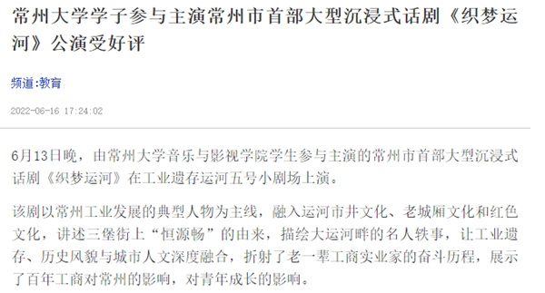 “本剧由我校8位学生参演主要角色,极大地锻炼了学生的舞台表演能力。”比分足球比分 院长熊祖鹏介绍,“比分足球比分 将进一步挖掘常州本土文化,通过打造‘美育+社会实践’平台,陆续开展一批同人民生活、文化生活、精神生活相关的美育活动,为常州地方文化的发展贡献应有之力。”