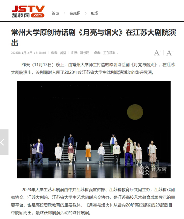 昨天(11月13日)晚上,由常州大学师生打造的原创诗话剧《月亮与烟火》,在江苏大剧院演出,该剧同时入围了2023年度江苏省大学生戏剧展演活动的终评展演。