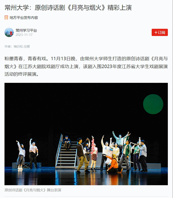 粉墨青春,青春有戏。11月13日晚,由常州大学师生打造的原创诗话剧《月亮与烟火》在江苏大剧院戏剧厅成功上演,该剧入围2023年度江苏省大学生戏剧展演活动的终评展演。
