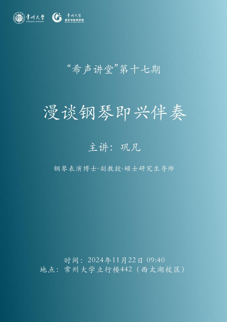 讲座主讲人巩凡,钢琴表演博士,常州大学比分足球比分 钢琴专业副教授,硕士研究生导师。讲座中,巩凡从他与钢琴即兴伴奏的“渊源”讲起,分享了自己在这一领域的学习与探索历程。随后,他全面而系统地介绍了钢琴即兴伴奏学科涵盖的内容,让听众对这一学科有了更加清晰而全面的认识。针对钢琴即兴伴奏学习的重难点,巩凡结合自身教学经验,提出了切实可行的学习方法和建议。对于完成一首歌曲即兴伴奏的过程及钢琴即兴伴奏的使用场景等方面,他结合实例,展示了钢琴即兴伴奏的灵活应用,进一步凸显了这一学科的艺术魅力和实用价值。他强调,即兴伴奏不仅要求演奏者具备扎实的钢琴技巧,更需具备良好的音乐感知力和创造力。