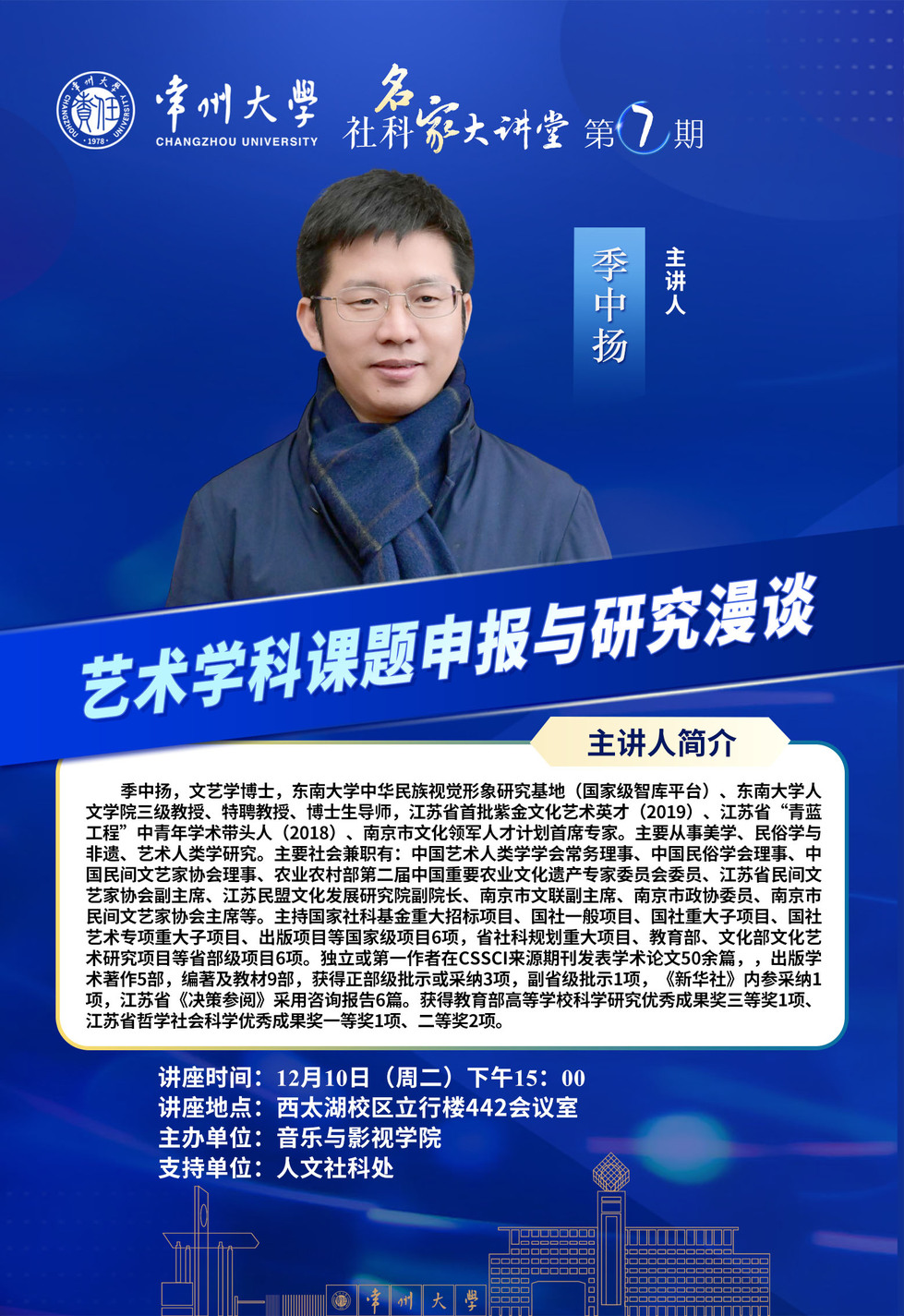 12月10日,社科名家大讲堂特邀东南大学季中扬教授在比分足球比分 立行楼442会议室开讲。讲座主题为“艺术学科课题申报与研究漫谈”。院长熊祖鹏、副院长王成文及比分足球比分 全体专业教师、研究生参加讲座。