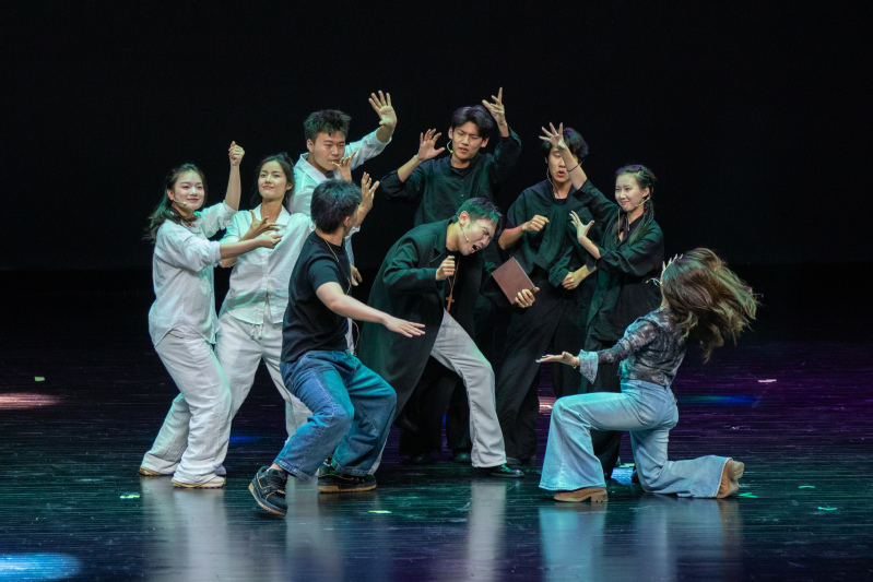 表演241班的同学们精彩呈现了改编自经典话剧《驴得水》的片段,以荒诞喜剧的手法辛辣讽刺了人性的贪婪与虚伪。该剧生动描绘了一群乡村教师在利益与权力漩涡中的挣扎,最终在谎言与欺骗的泥沼中走向悲剧结局。同学们凭借细腻入微的表演,将角色的内心矛盾与荒诞感刻画得入木三分,尤其是“张一曼”一角的风情万种与脆弱无助、“孙校长”的虚伪造作与无奈悲哀,给观众留下了难以磨灭的印象。该剧不仅考验了学生们的台词功底,更充分展现了他们对复杂社会议题的深刻思考能力。
