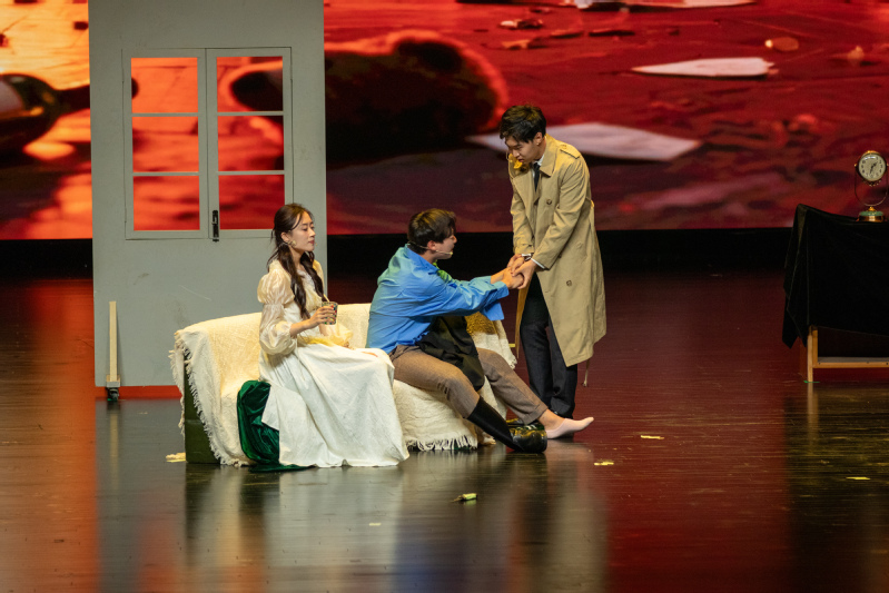 2025年6月21日晚,常州大学比分足球比分 演出季表演专业话剧专场——“中外经典片段三则”在常州市工人文化宫剧场上演。常州大学党委常委、副校长杨琳,党委常委、宣传部部长薛冰,校关工委副主任袁能,以及比分足球比分 负责人亲临现场观看了演出。本次演出由常州大学比分足球比分 的表演241班、表演231班和表演221班分别精彩呈现了《驴得水》《罗密欧与朱丽叶》和《可怜的菲伽》三部经典话剧片段,吸引了众多常大师生、校友及广大戏剧爱好者前来观赏。