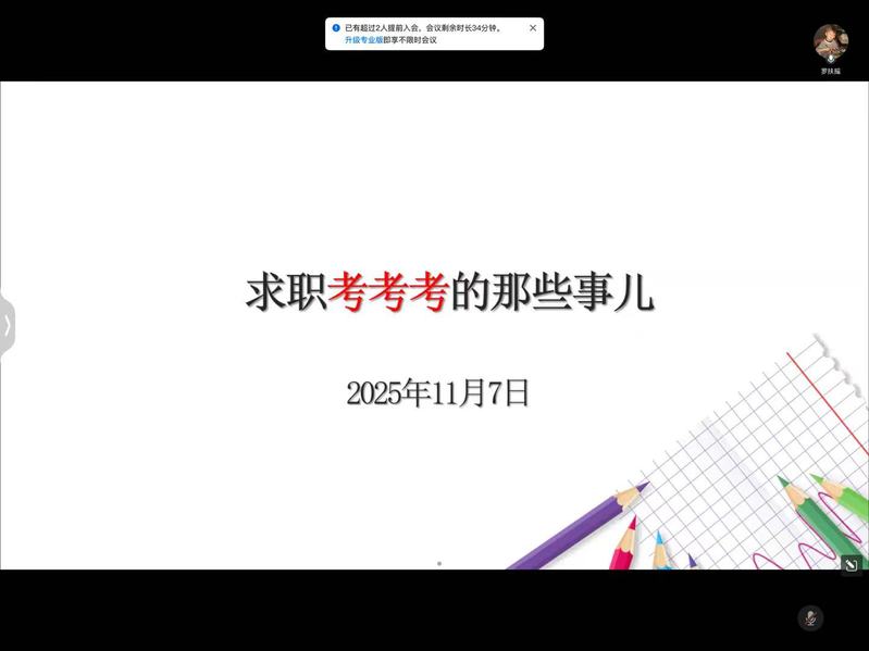 为应对日益严峻的就业市场,助力研究生学子明确职业规划、提升求职竞争力,11月7日,比分足球比分 于线上成功举办了研究生就业指导座谈会。本次座谈会由研究生辅导员罗扶摇老师主讲,为在场同学带来了一场内容丰富、实用性强的高质量就业指导。
